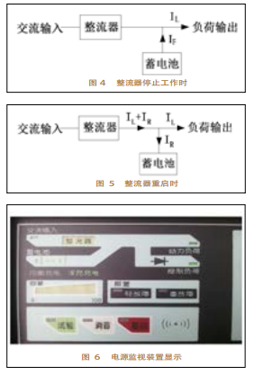 (4)當(dāng)從停電狀態(tài)到電源康復(fù)供電時,整流器再次發(fā)動,此刻整流器既要向負(fù)荷輸出供電,同時還要向蓄電池充電,補(bǔ)充蓄電池消耗的電能,直至蓄電池充電結(jié)束。如圖5所示。